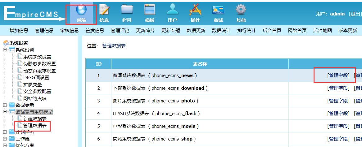 第一步:进入管理后台,点击“系统”–“数据表与系统模型”—“管理数据表”—管理字段;
