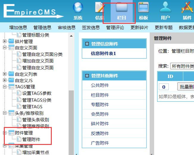 点击“栏目”—“附件管理”;
