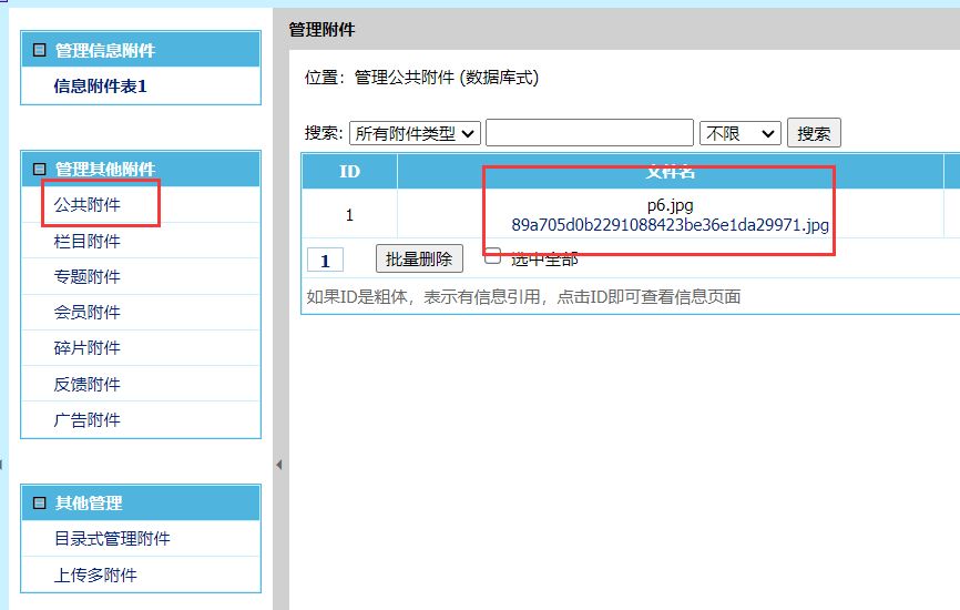 上传后,点击公共附件,就可以查看这个图片的路径了。这里注意:默认帝国后台只允许上传jpg图片,上传其它类型图片,将不显示。相关设置:帝国CMS网站如何设置上传文件类型
